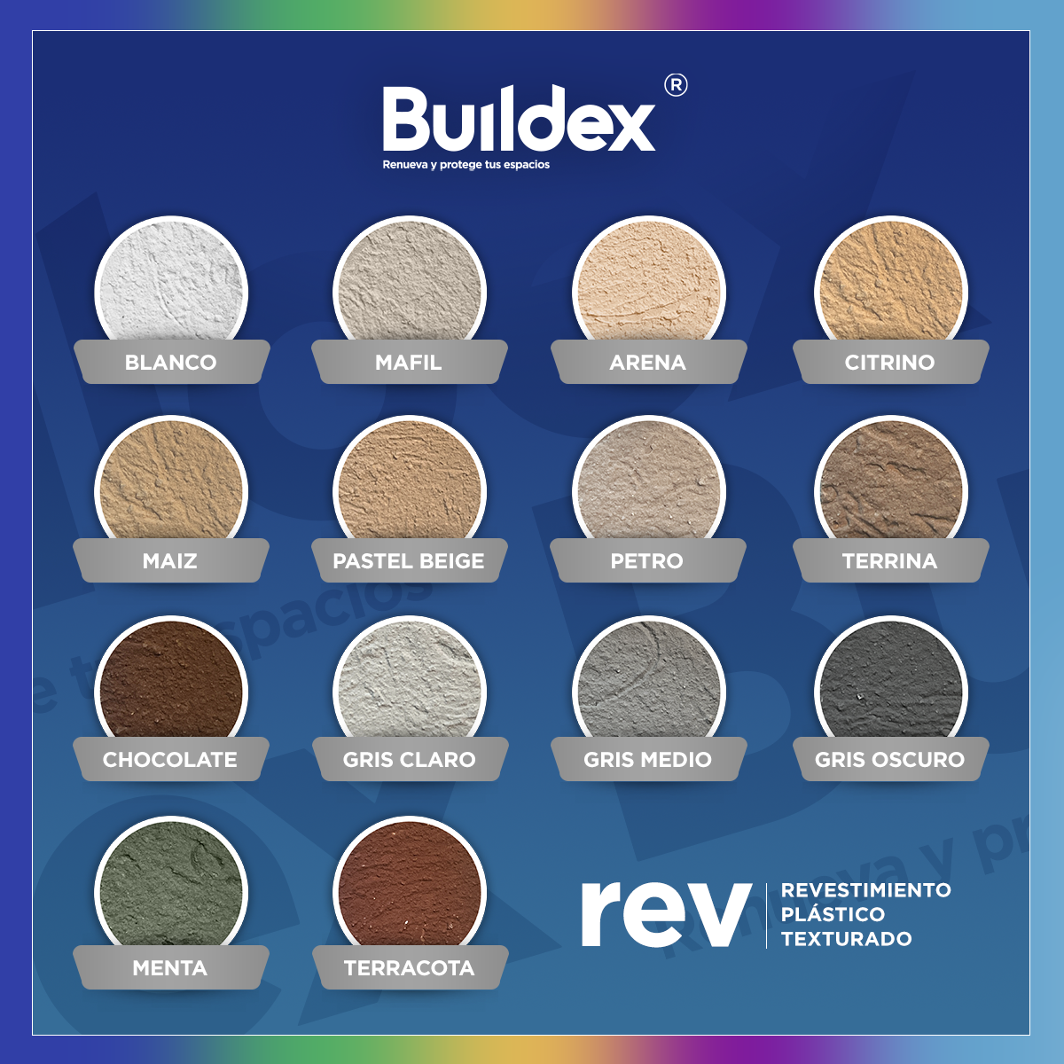 Buildex Revestimiento Plástico está disponible en 9 colores firmes gracias a su composición con pigmentos de dióxido de titanio y cargas inertes.